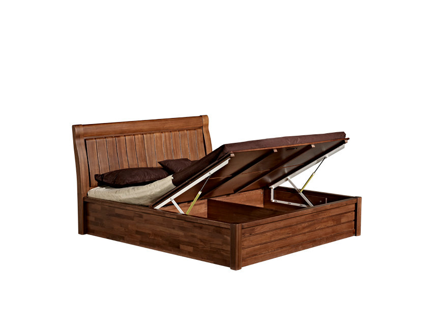Solid timber frame, sleigh back, standard base, vertical slat back, with storage box base.